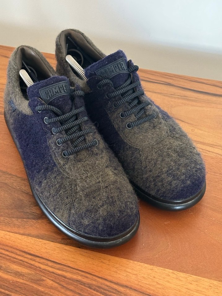 Gri ve lacivert tonlarında yumuşak dokulu rahat erkek ayakkabılar. Siyah bağcık ve konforlu tabanla günlük kullanıma uygun. Sıfır gibi etiketli mağaza deneme ürünü