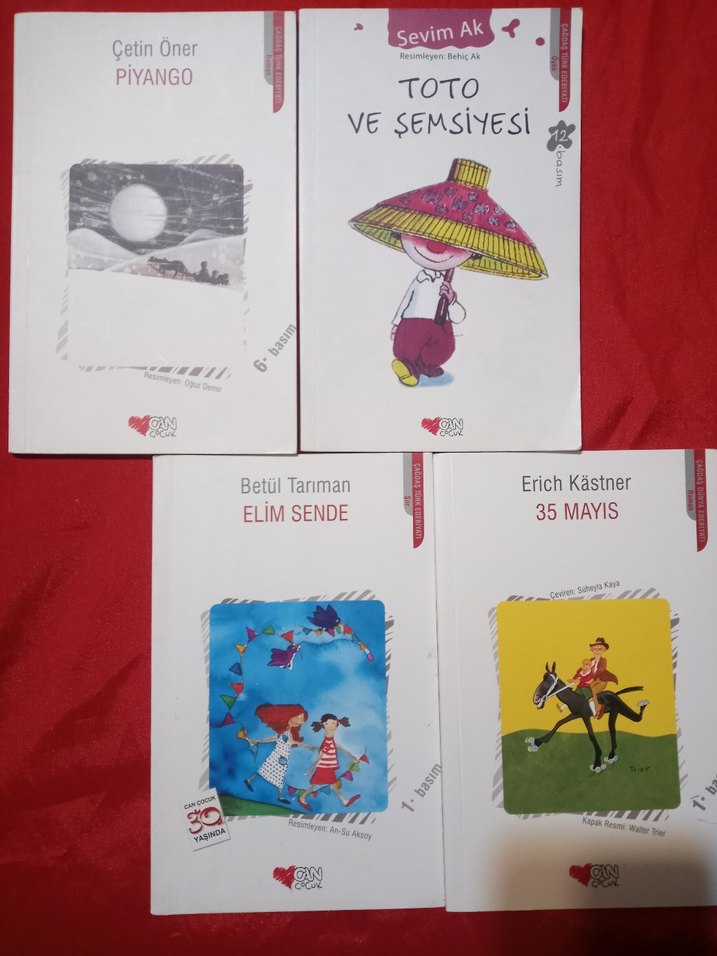 Çetin Öner, Sevim Ak, Betül Tanman ve Erich Kästner'in çocuk kitapları Piyango, Toto ve Şemsiyesi, Elim Sende ve 35 Mayıs adlı 4 kitaplık set. Can Çocuk Yayınları 1 şiir 3 hikaye kitabı birlikte satıyorum. Temiz okunmuş kitaplardır. Yırtık, karalama, koparma yoktur