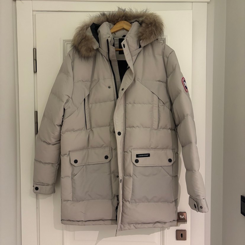 Gri renkli, kürklü kapüşonlu, uzun kollu erkek mont. Etiketi yok ama hiç giyilmedi hiçbir sorunu yok