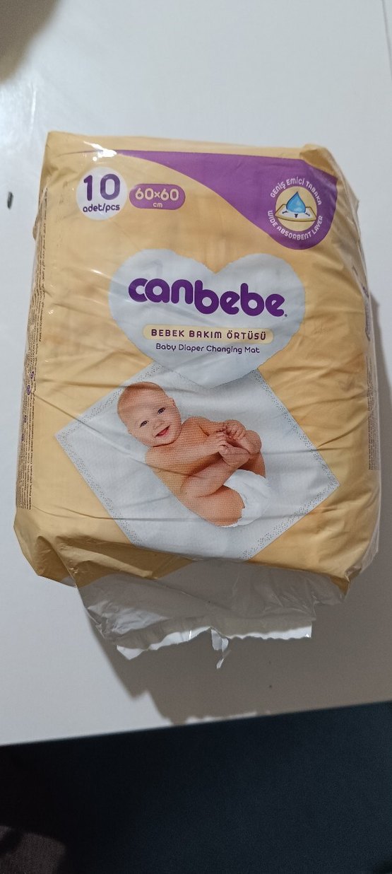 Canbebe bebek bakım örtüsü, 60x60 cm ebatlarında, 10 adetlik paket. Kimyasal içermeyen, yumuşak ve emici malzeme.