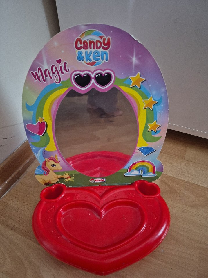 Candy & Ken markalı, kalp şeklinde kırmızı tepsili, yıldızlar, kalpler ve tek boynuzlu at figürlü renkli çocuk aynasıdır.