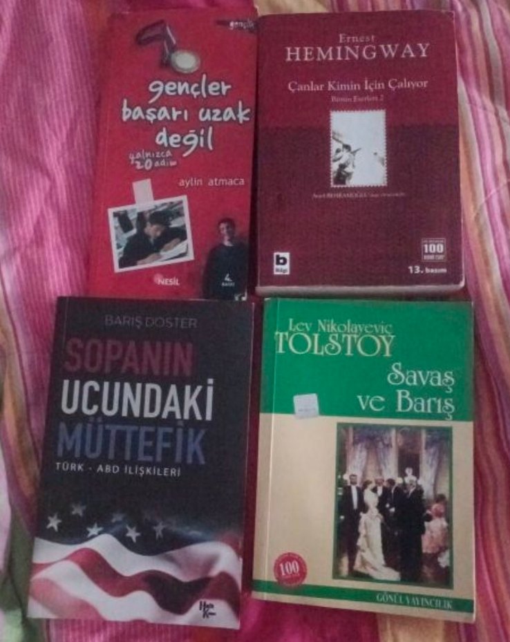 çanlar kimin için çalıyor 150 tl., diğerleri 60 tl. Hemingway, Tolstoy ve diğer yazarların savaş, barış ve başarı temalı dört kitabından oluşan set.