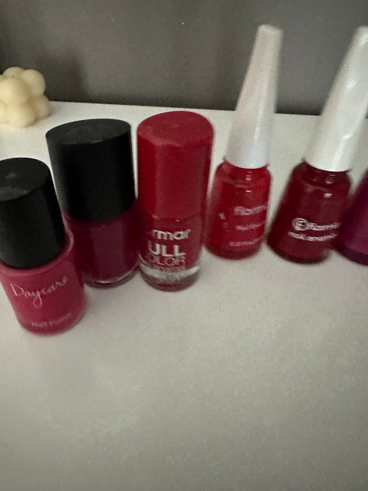 Farklı şişe tasarımlarında canlı kırmızı tonlarda renkli oje seti.