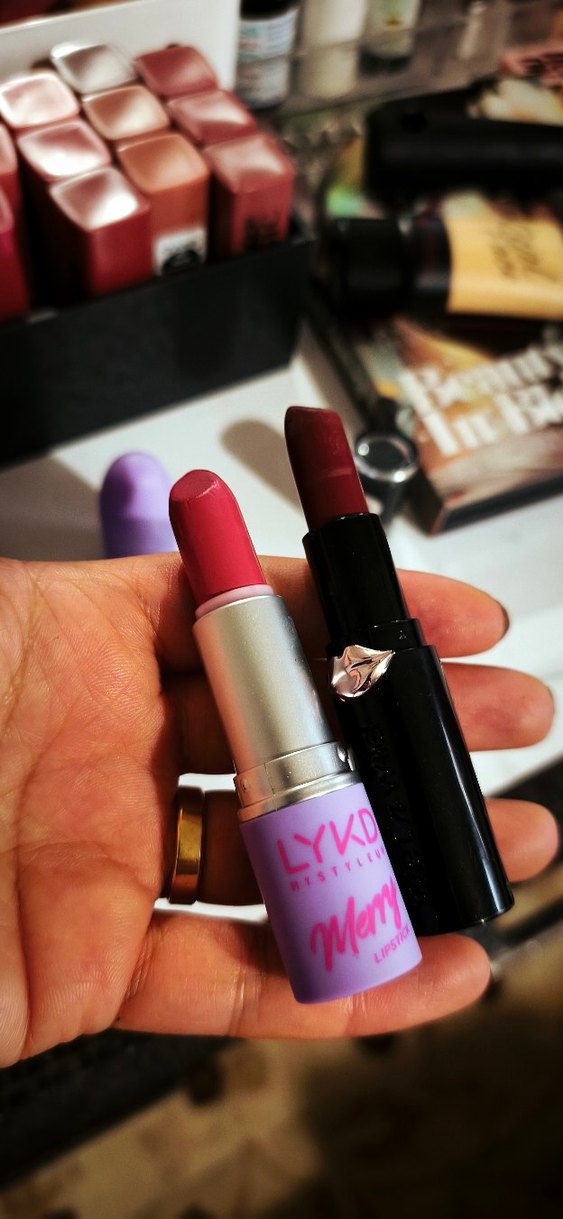 İki canlı kırmızı ruj, biri mor-silver kapaklı, diğeri dudak şeklinde detaylı siyah kapaklı. Üzerinde LYKD yazısı bulunur. gratisten denendi 2 adet fiyati