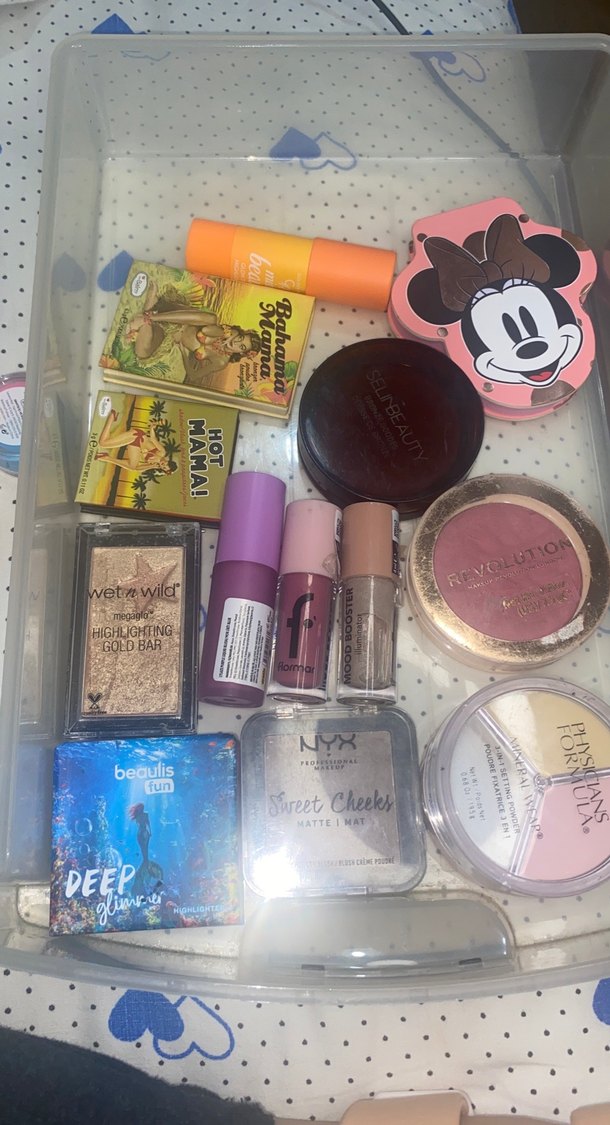 Çeşitli markalardan pembe tonlarda allık, aydınlatıcı ve ruj içeren canlı makyaj ürünleri seti. Canlı renkler ve kompakt ambalajlar sunar.