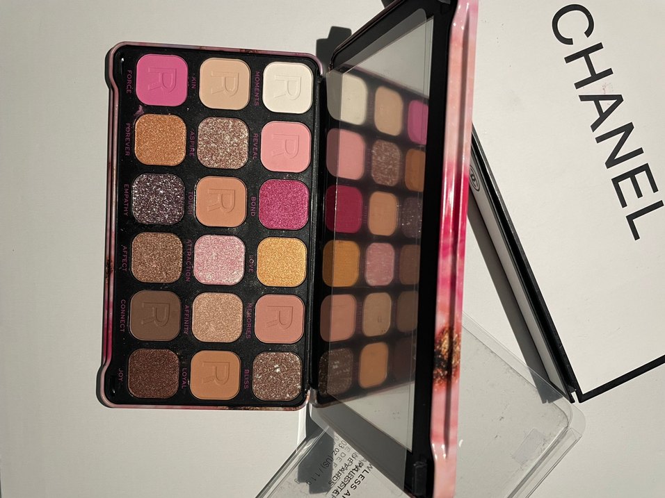 Canlı pembe ve tamamlayıcı tonlarda mat ve ışıltılı farlar içeren palet, uygulama için aynaya sahiptir.