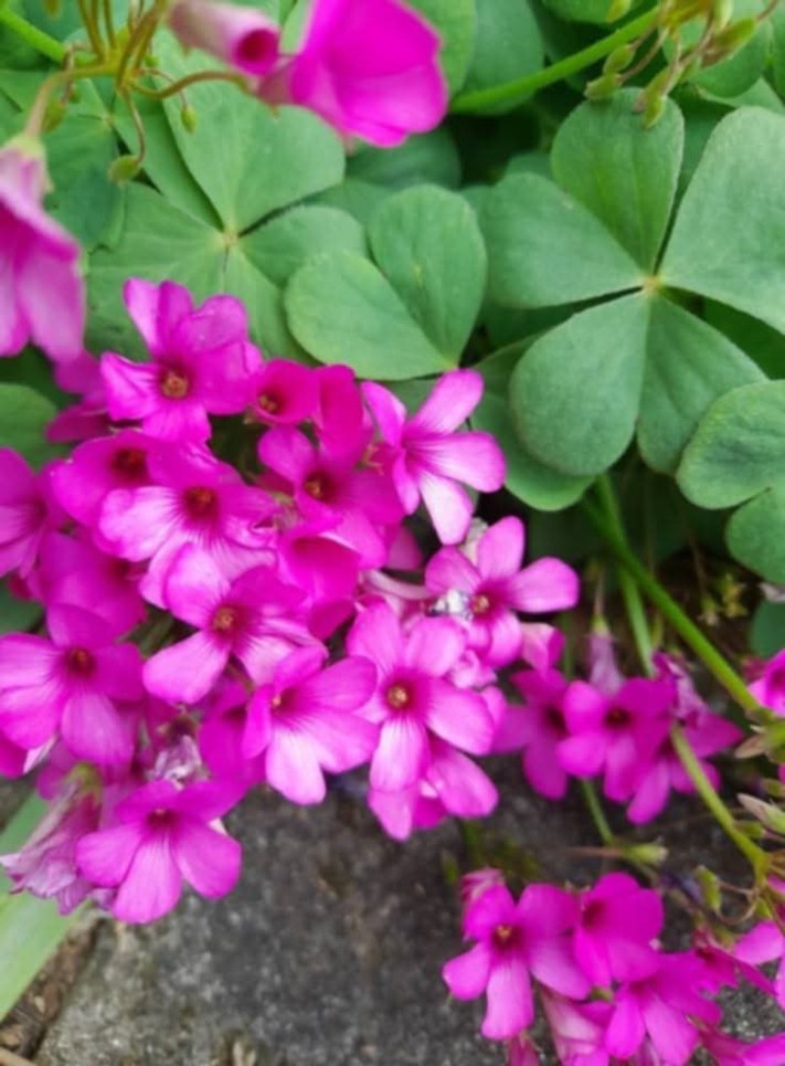 Canlı pembe tonlarında çiçekler, yeşil yonca yaprakları ile çevrili, renkli ve canlı görünüyor.