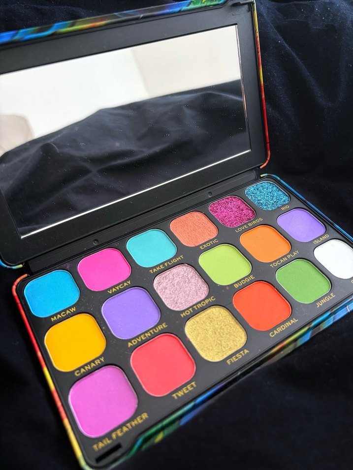 Canlı mavi, pembe, yeşil, mor ve altın tonları içeren çok renkli göz farı paleti, içinde ayna barındırır.