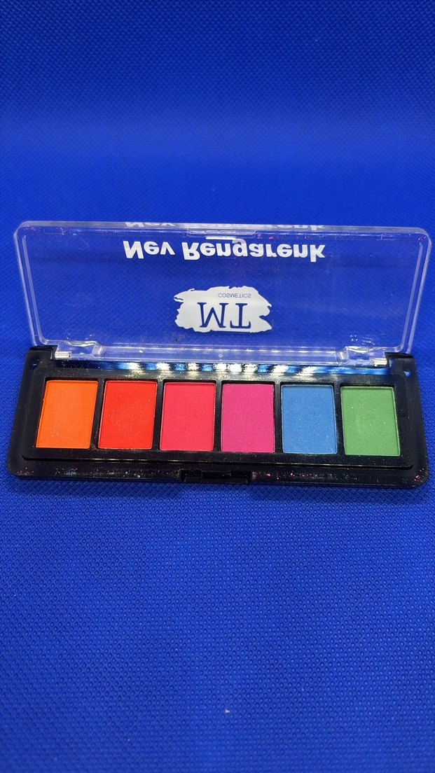 Canlı turuncu, kırmızı, pembe, mavi ve yeşil tonlarında koyu renkli göz farı paleti. Şeffaf kapağında "WL" yazısı bulunur.