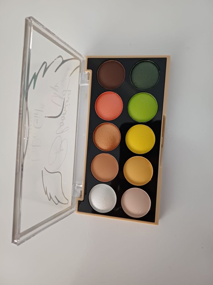 Canlı yeşil, sarı, turuncu, kahverengi ve nötr tonlar içeren göz farı paleti, farklı makyaj stilleri yaratmak için uygundur.
