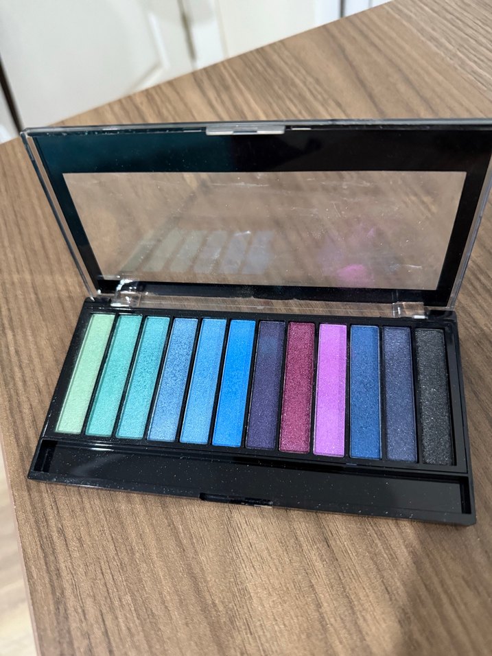 Canlı yeşil, mavi, mor ve siyah tonlarından oluşan çok renkli göz farı paleti.