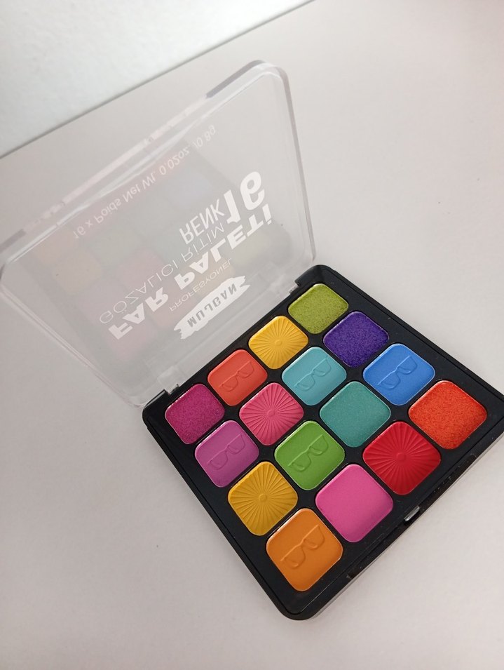 Canlı ve açık tonlarda çok renkli göz farı paleti, şeffaf kapaklı kompakt kutuda.