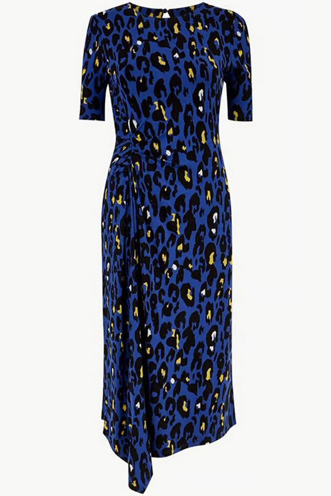 Canlı Saks Mavisi Leopar Desenli Kruvaze Detaylı Midi Elbise