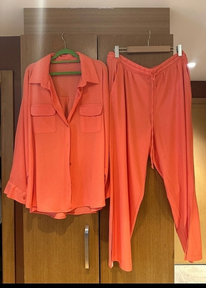 canlı turuncu ikili takım beli lastikli paçası yırtmaçlı 44-50 beden aralığında iki kez kullanıldı marka temsîlî harika bir takım..