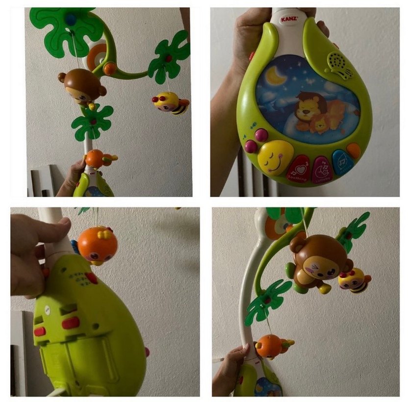 Canlı yeşil renkli müzikli oyuncak, asılı hayvan figürleri ve ses efektleri için düğmeler içerir, bebekleri eğlendirmek için tasarlanmıştır. Çalışır durumda dönence