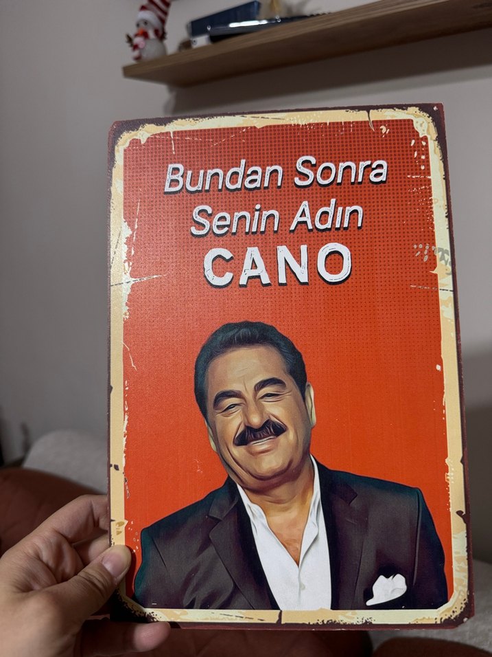Parlak camel renginde, "Bundan Sonra Senin Adın CANO" yazılı ve adam portresi bulunan vintage görünümlü tablo.