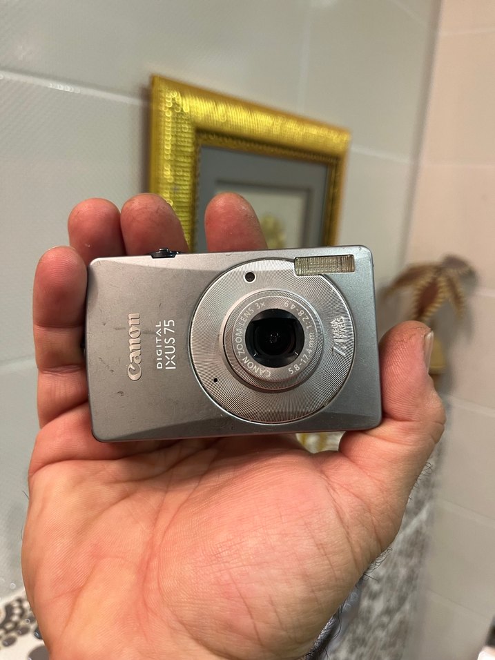 Kompakt gri Canon Digital IXUS 75 fotoğraf makinesi, dahili flaş ve 7.1 megapiksel çözünürlük ile. Günlük fotoğrafçılığa uygun. Ürünümü gayet iyi durumda sorunsuz çalışıyor yanında kelebek şarj aleti ile gelecektir