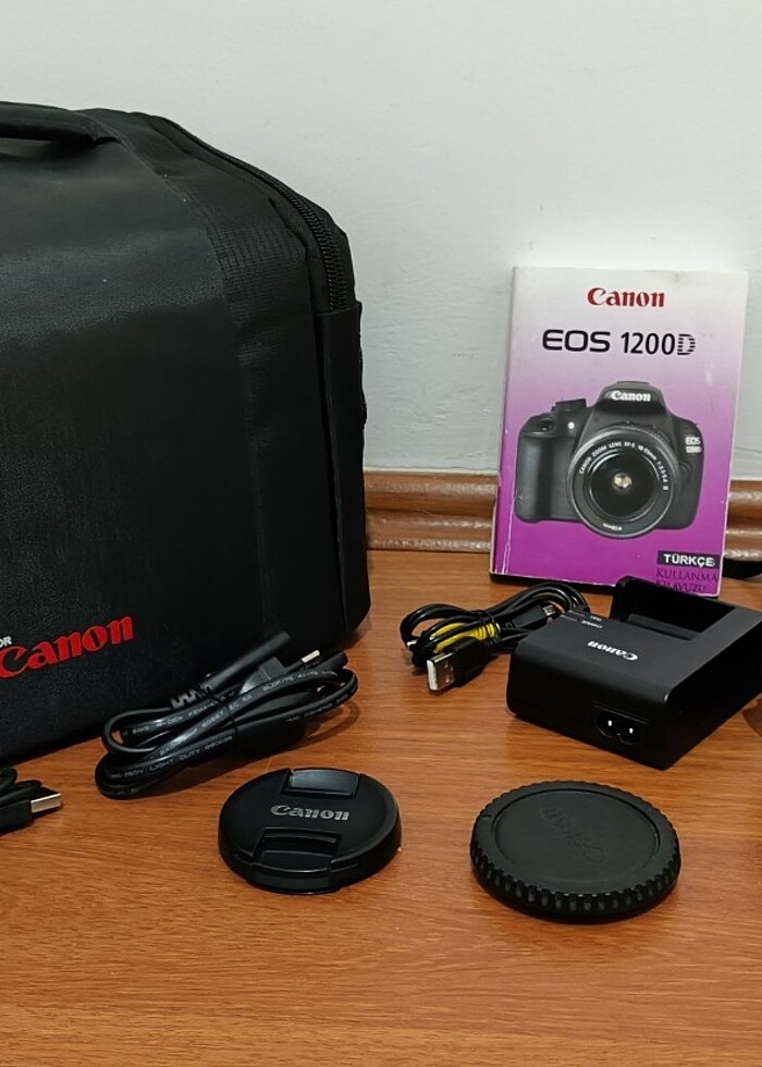 Temiz Canon EOS 1200D. shutter sayisi yanlis hatirlamiyorsam 10 bin civarinda. yaninda 18-55 lens, SD kart, taçima çantasi, kitapçik, aski Aparati,lens koruma kapaklari ve baglanti kablolari mevcut. batarya durumu çok iyi.