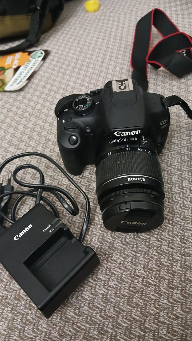 Canon EOS 1200D dijital fotoğraf makinesi, 18-55mm lens ve şarj cihazı ile birlikte. Siyah gövde ve kullanımı kolay kontroller içerir. 1 sene kullanıldı okul için sorunu yoktur