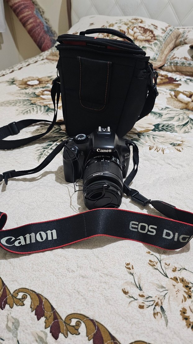 Canon EOS dijital fotoğraf makinesi siyah renkte, çıkarılabilir lens ve taşıma çantası ile birlikte gelir.