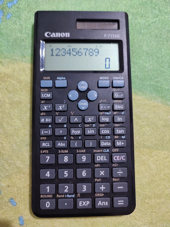 Canon F-715SG hesap makinesi koyu yeşil renkte, çok fonksiyonlu tuşlar ve net ekran içerir. Ans ve EXP gibi özellikleri destekler. çalışır durumda