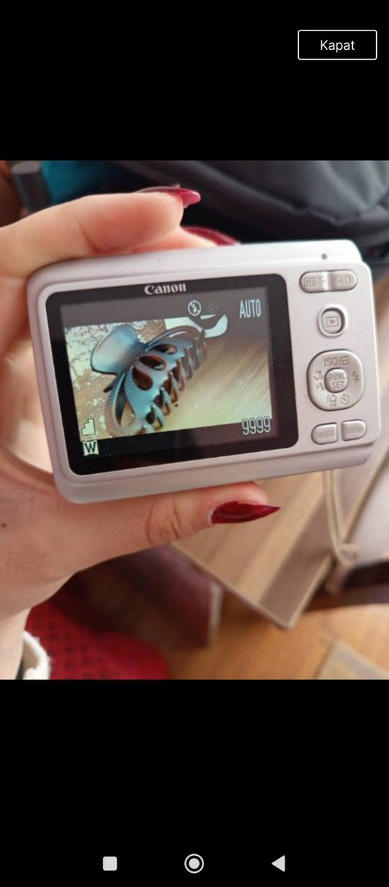 Canon markalı, kullanımı kolay tuşlara ve net ekrana sahip gri renkli kompakt dijital fotoğraf makinesi.