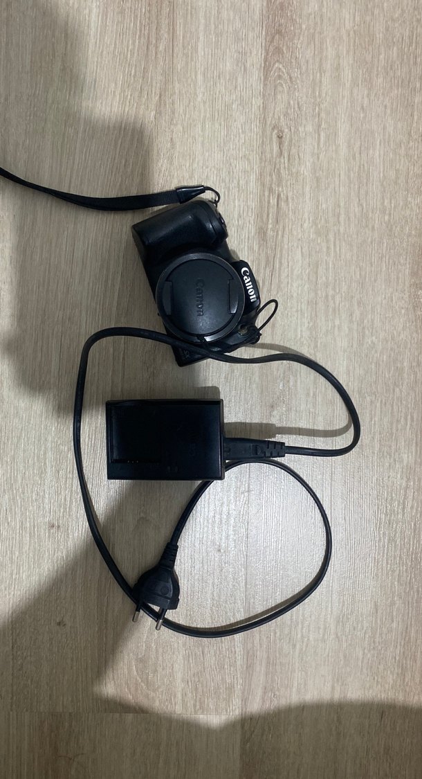 Üzerinde kayış bulunan siyah Canon dijital fotoğraf makinesi ve şarj cihazı ile birlikte. Anları yakalamak için uygun.