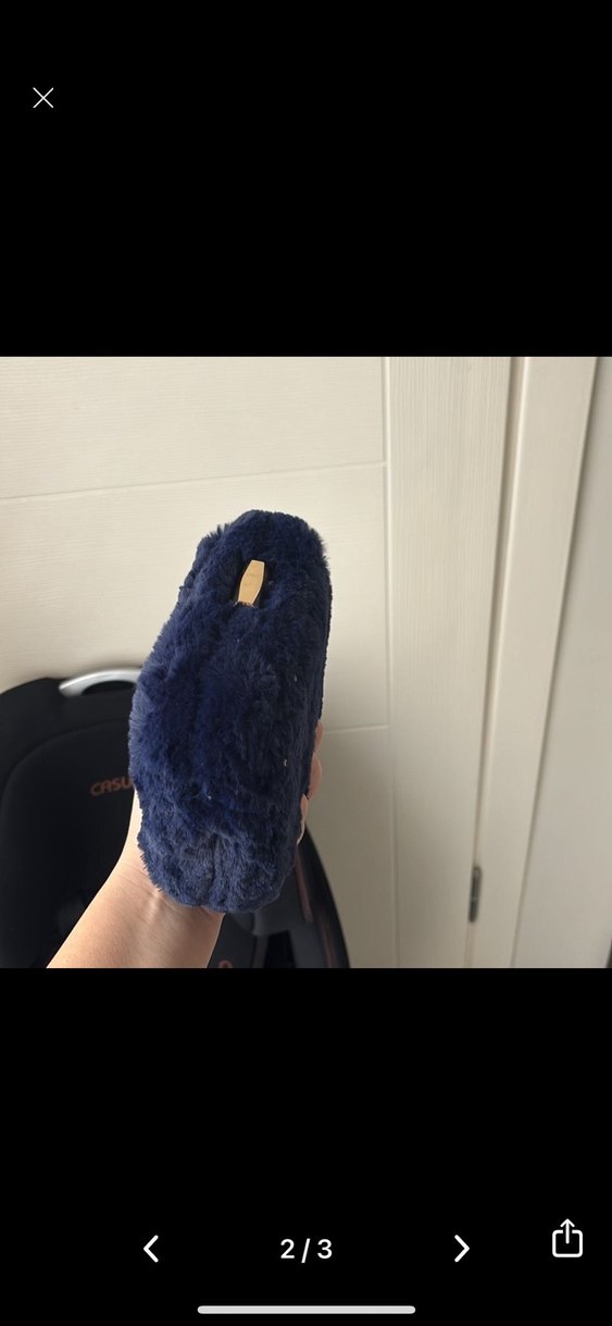 Kızlar için koyu lacivert, yumuşak kumaş ve kürk detaylı sıcak ev terliği, rahat sokak stili sunar. Yurtdısından hediye geldi hic kullanılmadı