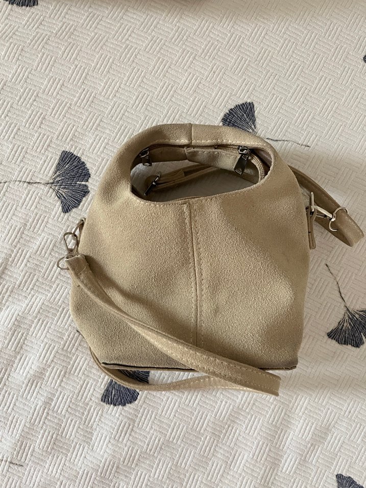 Bej süet kadın çanta, tokalı ve desen içermeyen minimalist tasarımıyla dikkat çekiyor. Günlük kullanım ve bohem tarz için uygun. alt kisminda kararmalar var yıkayınca geçecektir uzun suredir kullanmiyorum uyguna veriyorum