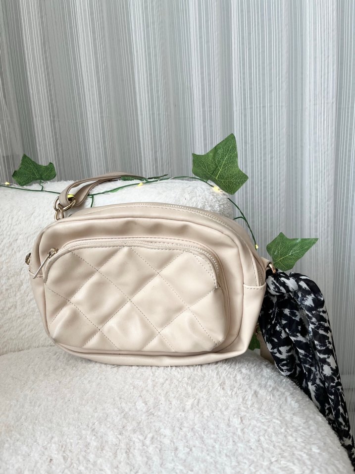 Püsküllü detaylı, yumuşak sentetik kumaştan yapılmış bej kadın omuz çantası. Önden kapitone cepli, pastel tonlarda, günlük sokak stiline uygun.