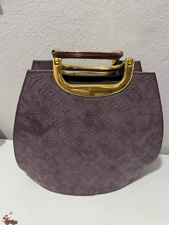 Mor süet kadın çantası, parlak yılan deseni ve altın saplarla. Fermuarlı bölmesi güvenli saklama sağlar, klasik şıklık ve çağdaş Paris tarzını birleştirir.