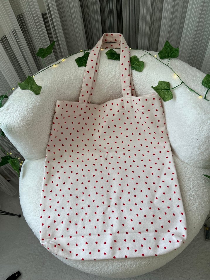Beyaz pamuklu kadın çantası, renkli kırmızı kalp desenleri ve dantel detaylarıyla günlük kullanıma uygun rahat bohem tarzda. Bez çanta