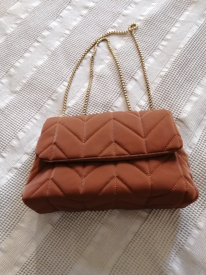 Hiçbir sorunu yok, temiz üründür. İster omuz, ister baget model olarak kullanılabilir. Rengi kahverengidir. Gold zincirdir. Sadece bir kere kullanıldı. Detaylar görselde mevcut. Deri ya da süet değildir. Yanılmıyorsam mat kapiton kumaştır.