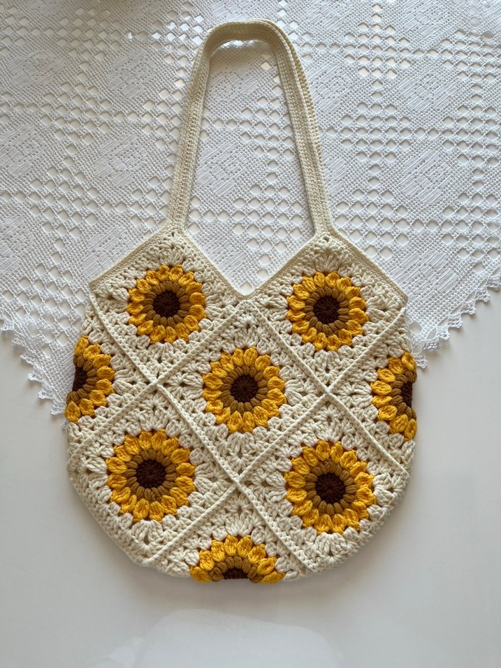 Ayçiçek desenli örme bohem kadın çantası, günlük kullanım için uygundur.