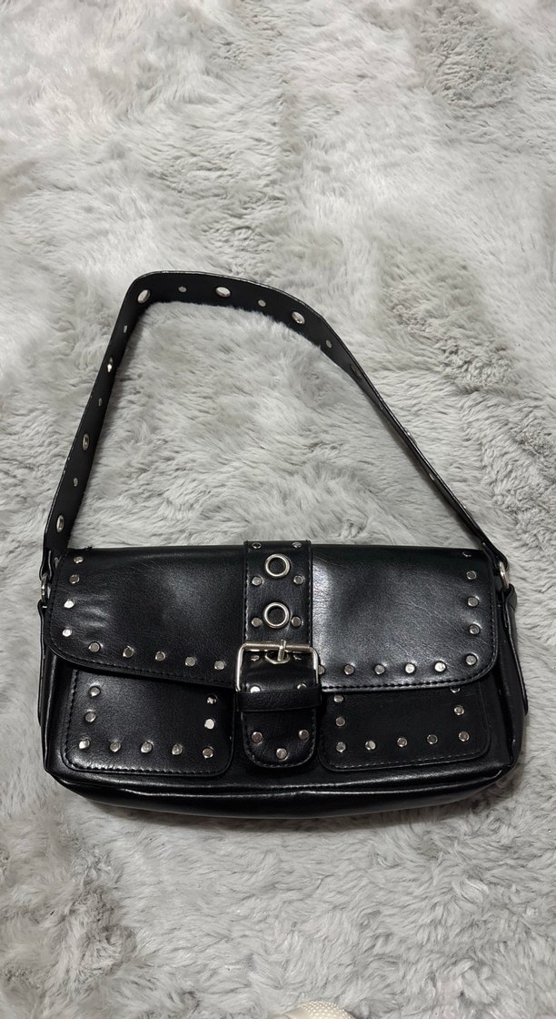 Kemerli kapak ve perçin detaylı siyah deri kadın çanta, gotik tarzda rock punk havası sunar. Günlük kullanıma uygundur.