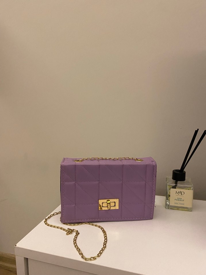 Pastel mor renkte, zincir detaylı ve saten görünümlü kare desenli kadın çantası. Günlük kullanıma uygun, çağdaş ve klasik Paris tarzı.
