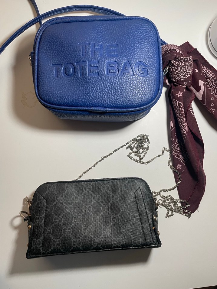 Kabartmalı yazılı koyu mavi deri tote çanta, zincir detayı ve desenli fular aksesuarıyla. Şık ve rahat sokak stili için uygun.tane fiyatı