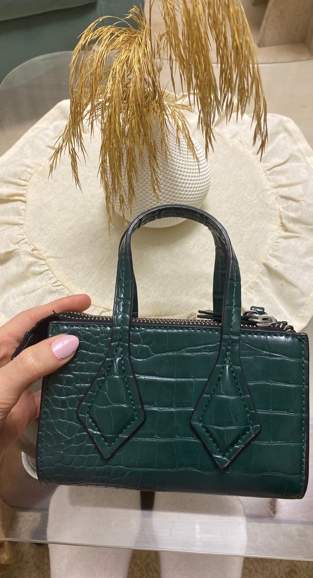 Koyu yeşil yılan desenli deri kadın çanta, fermuarlı ve çift kulplu. Trendy casual sokak stiline uygun.