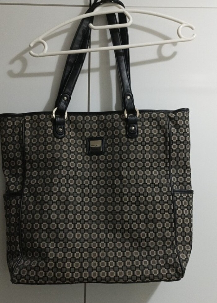 Nine West marka seyahat çantası. Koyu haki ve siyah renk desenli. Boy 40, en 35, yan en derinlik 13 cm. İçinde ara bölmesi var.