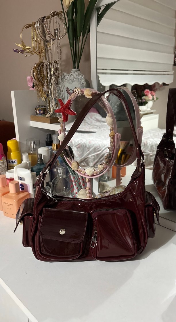 Bordo deri tokalı kadın çanta, önünde çoklu cepler ve baskılı deseniyle Paris tarzı koyu ve modaya uygun görünüm sunar. Günlük kullanım için uygundur.