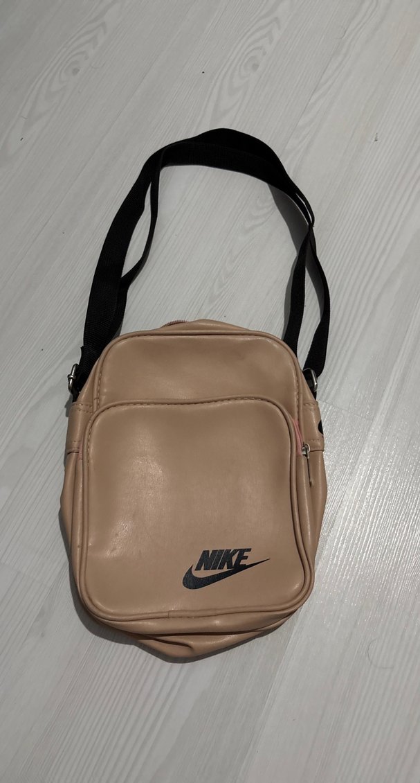 Bej renkli, minimalist tasarımlı erkek omuz çantası. Siyah askıları ve 'NIKE' logosu ile şık, rahat bir görünüm sunar.