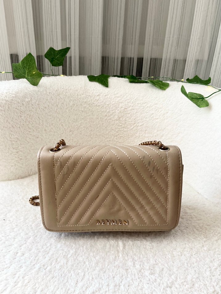 Bej renkte deri kadın çanta, modern klasik tasarım, kemerli detay ve hafif yılan deseni dokusuna sahip. Beymen logosu bulunur, günlük kullanım için Paris şıklığı sunar.