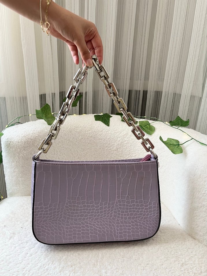 Pastel mor yılan desenli deri çanta, zincir detaylı sapıyla sokak stiline uygun trend bir görünüme sahip.