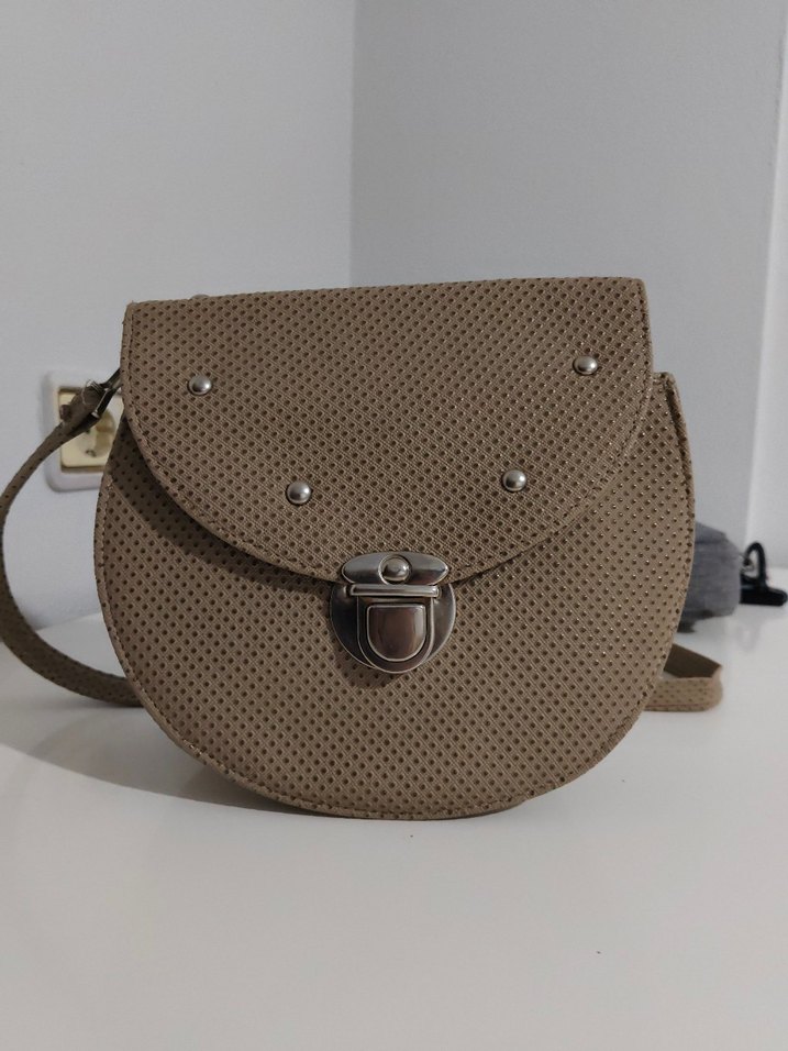 Bej renkli deri kadın çanta, tokalı ve kemerli tasarıma sahiptir. Hafif dokulu, gündelik kullanıma uygun çağdaş bir modeldir.