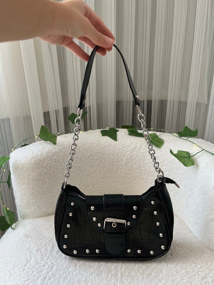 Siyah yılan derisi desenli deri kadın çanta, kemer tokası ve zincirli sapıyla trend goth tarzını yansıtıyor. Kemer Tokalı Siyah Yılan Derisi Desenli Kadın Çanta