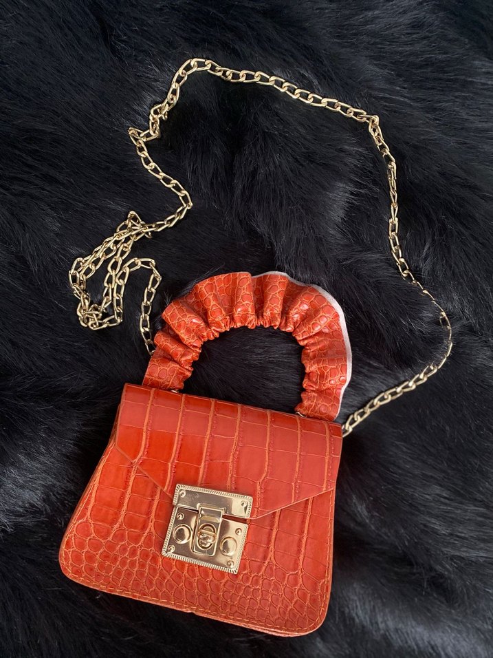 Kırmızı parlak yılan desenli deri çanta, kürk detaylı ve altın zincir askılı, cesur sokak tarzlarına uygun.