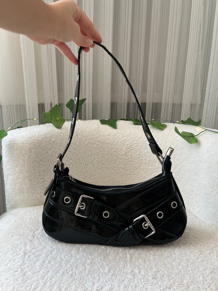 Siyah yılan desenli deri çanta, kemer detaylarıyla trendy ve gündelik kullanıma uygun goth Paris tarzını yansıtıyor.