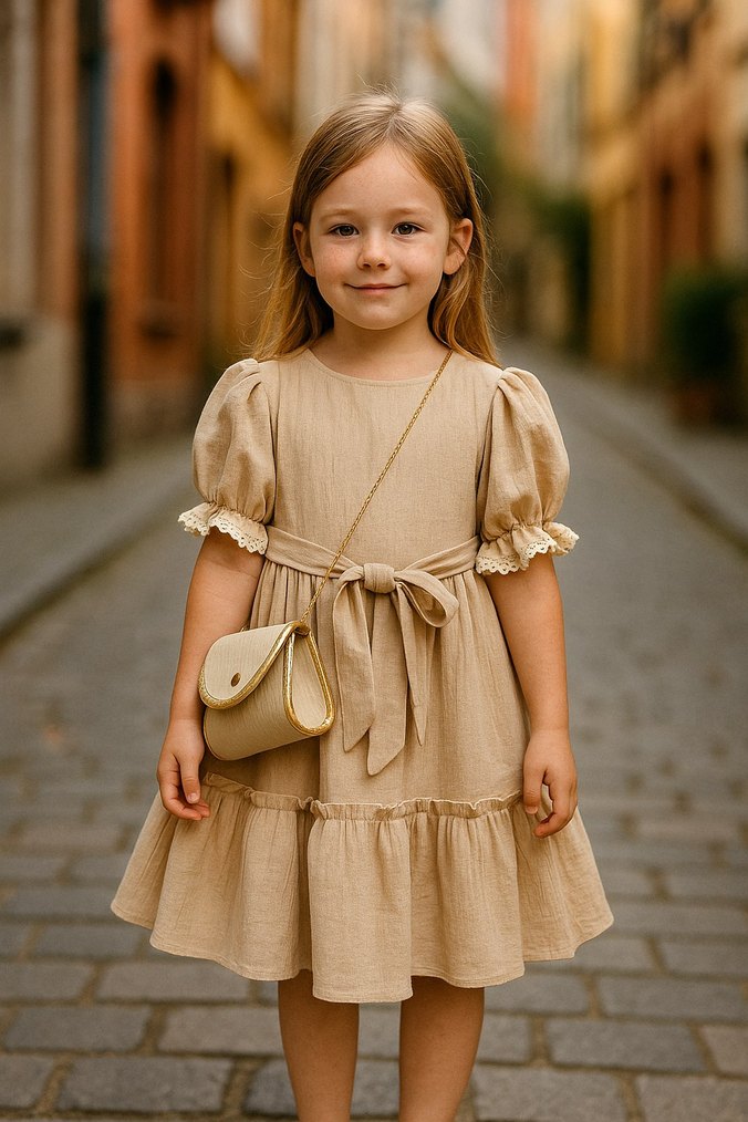 Çanta aksesuarlı Bej Bohem Kız Elbisesi Fırfırlı ve Nakışlı