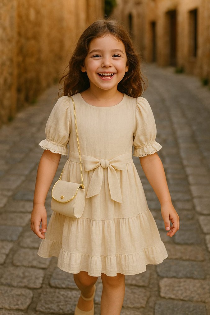 Bej renkli keten kumaştan yapılmış, bol kesimli kız çocuk elbisesi. Fırfır detaylı, askılı kollu ve nakışlı desene sahiptir. Yuvarlak yaka ve bohem tarzda. 5-7 yaş arasındadır lütfen alırken beden belirtiniz