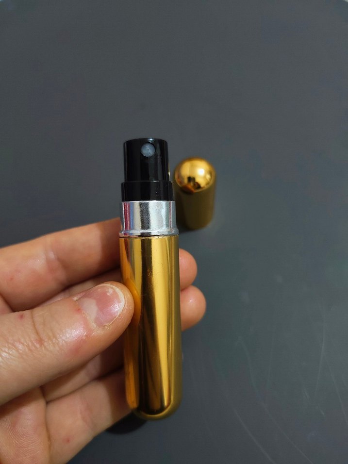 Altın renkli, siyah sprey başlıklı ve çıkarılabilir kapaklı kadın parfüm şişesi. Yeniden doldurulabilir, seyehat veya çanta boy mini parfüm şişesi.